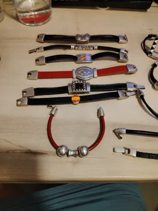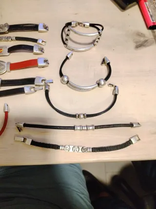 Se venden pulseras de diseño único, no hay dos iguales a no ser que sea por encargo, piezas con un baño de plata por electrolisis, echas a medida y pudiendo combinar con otras piezas y colores de cuero u otro tipo de broche. Ideales para regalo o para ti. El precio sería entre 7 y 15 euros dependiendo de la cantidad de entrepiezas que requiera el comprador. Pulseras para hombre y mujer, cualquier información no dudes en preguntar.