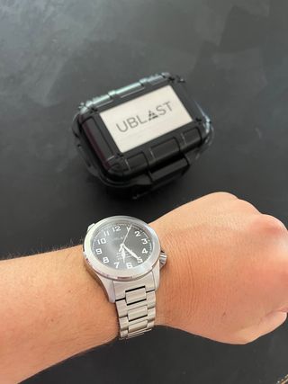 Reloj de pulsera Ublast Freedom para hombre. Diseño moderno y elegante. - Correa de eslabones plateada. - Esfera oscura con números arábigos.