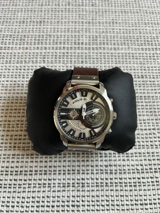 Reloj de pulsera con diseño deportivo y elegante. - Correa de cuero marrón. - Esfera plateada con detalles en negro. - Múltiples subesferas y marcadores. - Bisel con escala taquimétrica. Reloj nuevo a extrenar