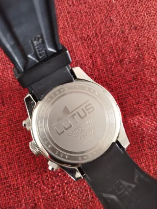 Elegante reloj de pulsera para hombre de la marca Lotus. La correa es de acero inoxidable. Está en muy buenas condiciones, pero hay que cambiarle la pila. Se vende con su caja original. - Brazalete de acero inoxidable en tono plateado. - Esfera negra con un toque marrón.