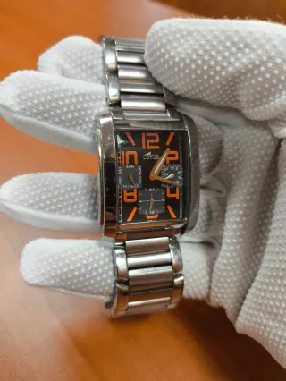 Elegante reloj de pulsera de la marca Lotus con un diseño moderno y llamativo. - Esfera negra con detalles en naranja. - Correa y caja de acero plateado. - Indicador de día de la semana y fecha.