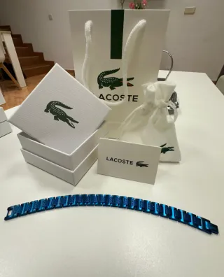 Vendo pulsera de hombre Lacoste nueva color plateado y azul en su caja y bolsa originales, acompañada de su bolsita guardapolvo. Una opción perfecta para un regalo de Navidad o cumpleaños, o para uso personal. Material acero inoxidable 100% Realizo envíos rápidos y cuidadosamente embalados para garantizar su seguridad.