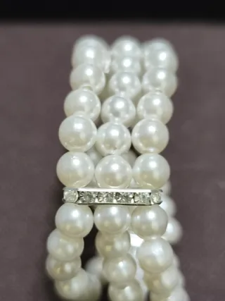 Elegante pulsera de perlas con detalles plateados. - Diseño de tres hileras. - Sin cierre, es elástica ## Ahorcador, Valenciana, peinetas, aderezo, fallas, mujer, niña, mantilla, fallera, huertana, cancan, Castellonera, magdalena, hogueras, foguerera##