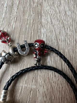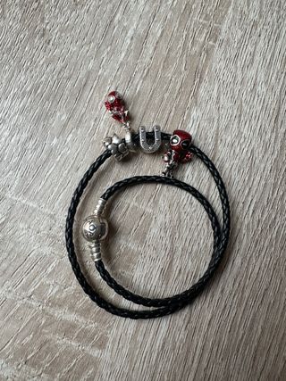 Pulsera de cuero trenzado en color negro con cierre de plata. - Incluye varios charms temáticos. - Cierre con logo de Pandora grabado. - NO usada, NUEVA - Tengo ticket