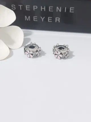 Set de dos charms para pulsera Pandora con un delicado diseño de flores. - Elaborados en plata. - Detalles en color rosa. - Diseño floral.