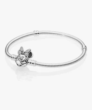 Pulsera de Minnie Mouse. El charm tiene detalles brillantes y un lazo. Tamaño 17 - Diseño de Minnie Mouse con lazo. - Eslabones plateados.