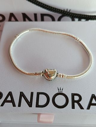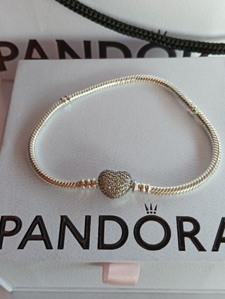 Elegante pulsera Pandora con un diseño de corazón y detalles brillantes. Perfecta para añadir un toque de estilo a tu muñeca. - Diseño de corazón central. - Cadena ajustable. - Acabado plateado. ENTREN A MI PERFIL