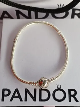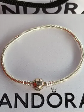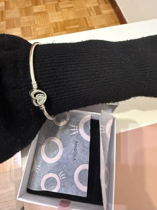 Pulsera rígida de la marca Pandora, con un tamaño de 17 cm.33€. Con 3 charm 66 €. Charm individual 15€. - Diseño elegante y atemporal. - Cierre seguro y funcional. Pulsera incluye la caja blanca de Pandora. Comprado en el stand de Pandora en el corte inglés.