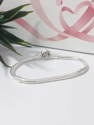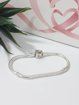 Elegante pulsera de la marca Pandora, talla 17. - Diseño de cadena tipo serpiente. - Cierre con detalle de flor o rosa. - Color plateado.