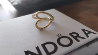 Conjunto de joyería Pandora con un diseño de corazón. Anillo Pandora Essence 163288Coo-52 Pulsera eslabones corazón dorado Pandora Me - Pulsera con eslabones plateados y un charm de corazón dorado. - Anillo con forma de corazón dorado.