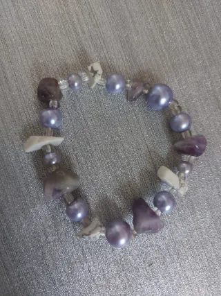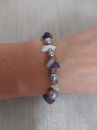 Bonita pulsera con cuentas de amatista y perlas de color morado. Elastica - Cuentas de amatista. - Perlas de color morado. - Detalles en plateado