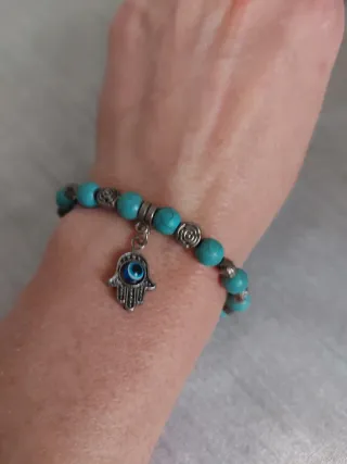 Bonita pulsera con cuentas de turquesa y detalles plateados. Incluye un charm de la Mano de Fátima. - Diseño con cuentas de turquesa. - Detalle de charm Mano de Fátima.