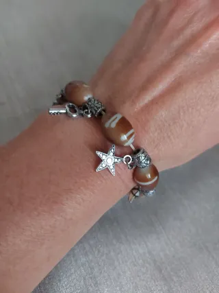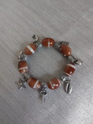 Pulsera con cuentas de estilo étnico y dijes. - Cuentas ovaladas de color marrón con vetas blancas. - Dijes plateados con forma de estrella, llave, caracola y un animal. - Separadores metálicos con diseño floral.