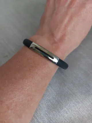 Pulsera con un diseño moderno y elegante. - Combinación de acero y caucho. - Acabado plateado y negro.