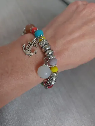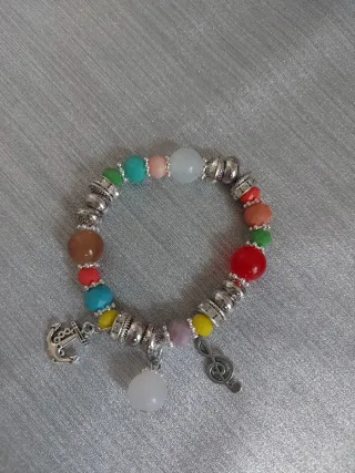 Bonita pulsera de fantasía con cuentas de colores y detalles plateados. - Cuenta con un charm de ancla. - Incluye un charm de clave de sol. - Posee un charm colgante de piedra blanca.