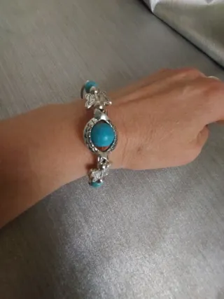 Bonita pulsera con un diseño delicado y llamativo. - Cuenta con un detalle central de piedra turquesa. - Adornada con pequeños abalorios plateados. - Incluye dijes en forma de mariposa. - Cadena extensible para ajustar a la muñeca.