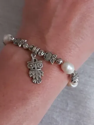 Bonita pulsera elástica con un diseño encantador. - Perlas de agua dulce. - Charm colgante con forma de búho. - Detalles metálicos plateados con motivos.