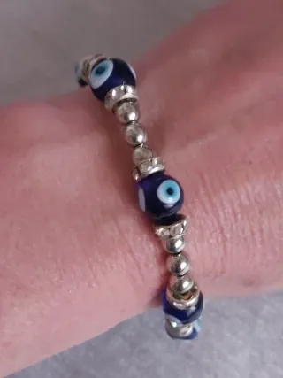 Pulsera con diseño de ojo turco y detalles plateados. Es ajustable para adaptarse a tu muñeca. - Cierre de cordón. - Cuentas con diseño de ojo turco. - Abalorios plateados.