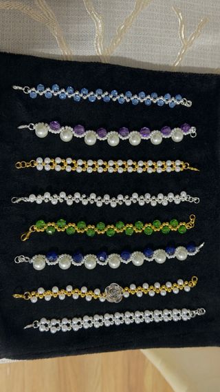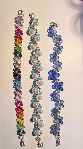 Conjunto de pulseras elaboradas artesanalmente con cuentas. - Diseños variados. - Detalles en tonos dorados y plateados. 4€ 1 unidad 8€ 2 unidades 10€ 3 unidades