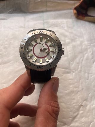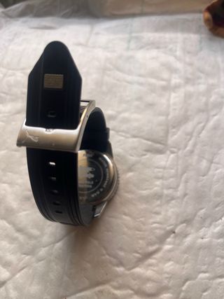 Reloj de pulsera con correa de silicona negra y detalles plateados. - Esfera oscura con marcadores horarios. - Bisel con detalles en azul y rojo. - Cierre de hebilla plateada.
