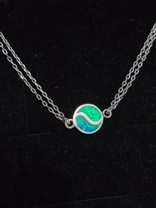 Hermosa pulsera de plata de ley con un diseño de yin yang incrustado en Ópalo sintético. El símbolo del yin yang representa la dualidad y el equilibrio de fuerzas opuestas e interconectadas en el universo.