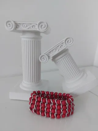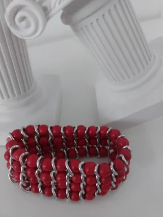 Elegante pulsera elástica con cuentas de coral y detalles plateados. - Diseño de tres filas. - Cuentas de coral. - Elementos metálicos plateados.