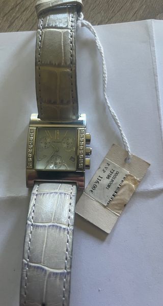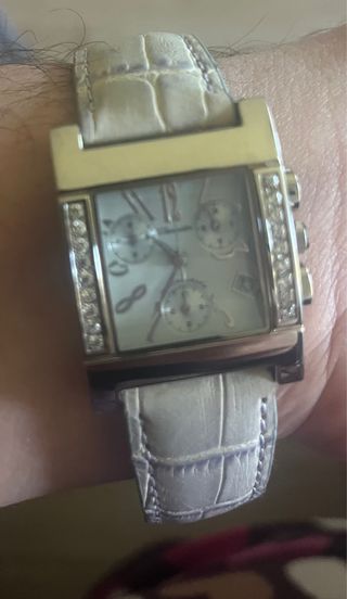Elegante reloj de pulsera con un diseño sofisticado. - Esfera rectangular con detalles. - Bisel adornado con pequeñas piedras brillantes. - Correa texturizada. - Múltiples subesferas en la pantalla.