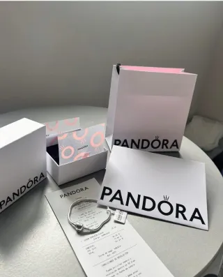 Elegante pulsera Pandora de plata con un diseño circular central adornado con circonitas brillantes. Perfecta para añadir un toque de luz a tu muñeca. - Diseño de serpiente. - Cierre de seguridad. - Detalle central con circonitas. Está sin estrenar, costó 80€, ideal para regalo de san Valentín, último precio, talla 23