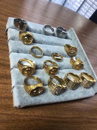 Lote variado de bisutería con acabados en oro y plata, fabricado en acero 316. Material eterno , no se oscurece , no cambia de color , nada puede con el ni el mar ni el sol ni el tiempo ... - Anillos con diseños diversos. - Pulsera de eslabones. -precio ud.