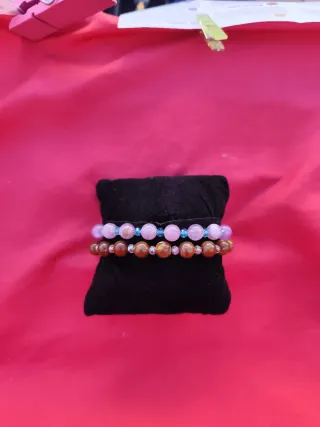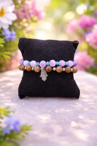Conjunto de dos pulseras elásticas con un charm de Mano de Fátima. - Una pulsera combina cuentas moradas y azules. - La otra pulsera tiene cuentas marrones y detalles plateados. - Incluye un charm de mano de Fátima plateado. - La pulsera está hecha con hilo de 0'8 mm.