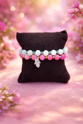 Elegante pulsera doble con un charm de Mano de Fátima. - Cuentas de color rosa y blanco. - Cristales tafetados. - Charm de mano de Fátima plateado.