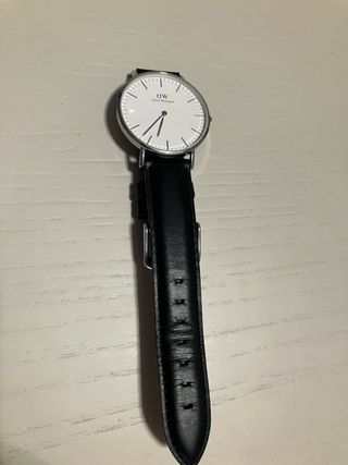 Elegante reloj de pulsera de señora Daniel Wellington con correa negra y detalles plateados. - Diseño clásico y minimalista. - Correa de cuero. - Caja de acero inoxidable.