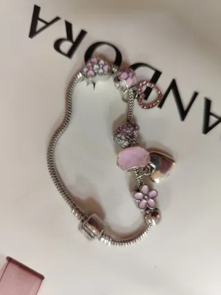 Preciosa pulsera tipo Pandora con varios charms. - Diseño con corazón y flor. - Detalles en color rosa y plata. - Nueva sín estrenar