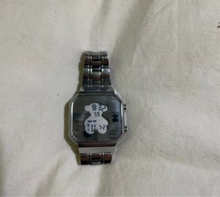 Reloj de pulsera con un diseño moderno y llamativo. - Esfera digital con detalle de oso. - Brazalete metálico. - Acabado plateado.