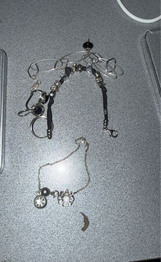Conjunto de bisutería con detalles en plata 925. - Colgante con cadena y cierre. - Pulsera con adornos. - Incluye un pequeño aro y un detalle en forma de luna.