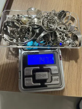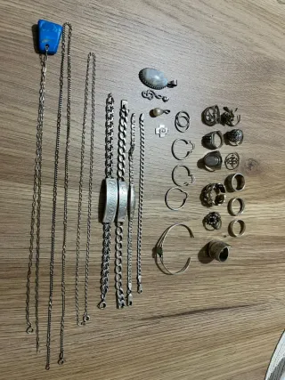 Conjunto de joyas de plata 925 con un peso total de 150 gramos. - Incluye varias cadenas y pulseras. - Variedad de anillos y colgantes. - Pieza con gema azul.