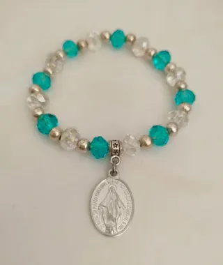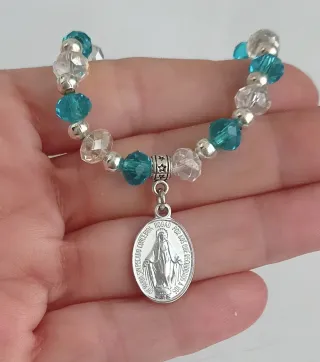Nueva. Bonita pulsera elástica con la medalla de la Virgen Milagrosa y cuentas de cristal. - Medalla original de la Virgen Milagrosa de aluminio. - Cuentas de cristal facetado de gran brillo. - Cuentas redondas plateadas. NO hago cambios ni envíos, recoger por mi zona.