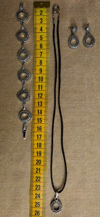Elegante conjunto de bisutería que incluye un colgante, un par de pendientes y una pulsera. - Diseño con detalles ornamentales. - Acabado plateado.