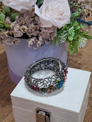 Elegante pulsera de metal con un diseño intrincado y detalles de flores y cristles. - Incrustaciones de flores multicolores y cristales. - Acabado plateado. -Con saquito guardapolvo para guardarla.