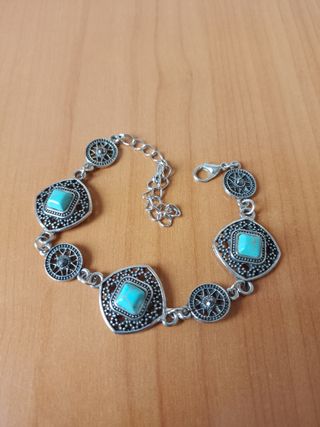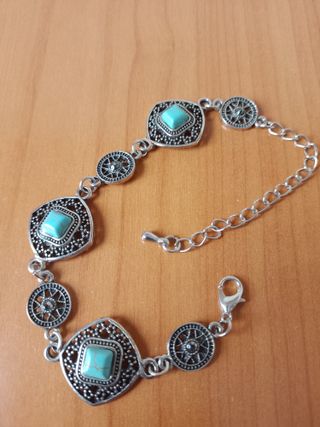Elegante pulsera de estilo antiguo. Cuenta con detalles intrincados y piedras de turquesa. - Nueva, a estrenar. - Diseño con múltiples piezas. - Cierre de mosquetón. Precio no negociable.
