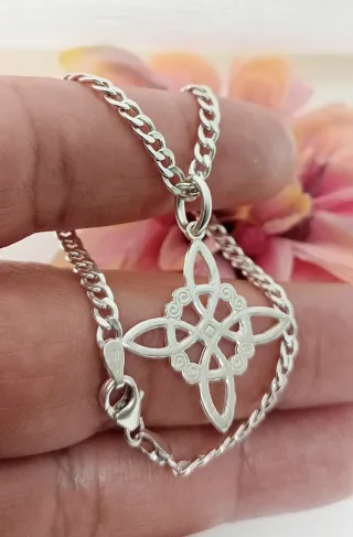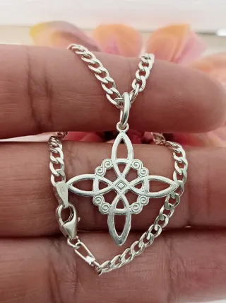 Increíble pulsera de 20 cm de largo y 0.30 cm de ancho, con adorable colgante de nudo de bruxa de 2.50 cm de alto por 2.50 cm de ancho, genuina plata de ley 925.