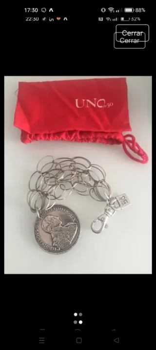 Pulsera de la marca UNO de 50 con un diseño de eslabones plateados y un colgante con forma de moneda. - Incluye bolsa de tela roja para guardarla.