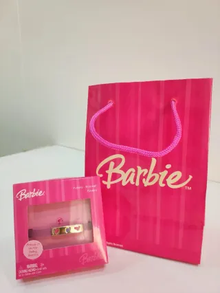 Pulsera de plata infantil de primera ley con correa ajustable de silicona de la marca Barbie. El estado es bueno, presenta un brillo dorado en la plata. Se acompaña en su caja original y bolsa de Barbie. Se puede entregar en mano en El Ejido y Almería capital. Incluye bolsa Barbie. Disponible para envíos.