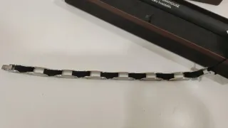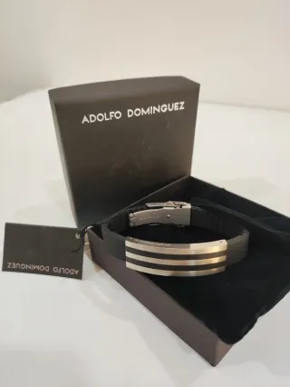 Elegante pulsera de la marca Adolfo Dominguez, con un diseño moderno y sofisticado. - Fabricada en acero inoxidable. - Combina detalles en negro y plateado. Pulsera de caballero de acero inoxidable de la firma Adolfo Domínguez. En perfecto estado, sin estrenar, acompañada de su caja. Se puede entregar en mano en El Ejido y Almería capital. También disponible para envío.