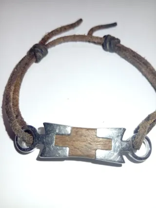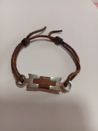 Pulsera con cordón de cuero y detalle central de plata y madera. - Diseño moderno y elegante. - Cierre ajustable.