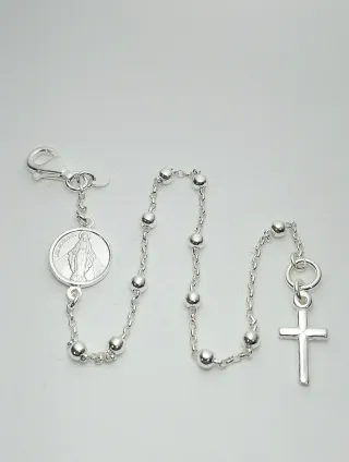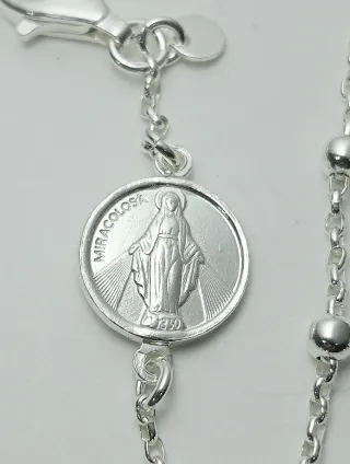 Elegante pulsera de Rosario elaborada en plata de ley 925. - Diseño con cuentas esféricas. - Colgante de la Virgen Milagrosa 16mm de diámetro. - Cruz de plata 12×8mm . - Cierre de mosquetón.