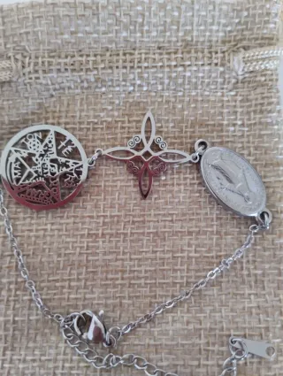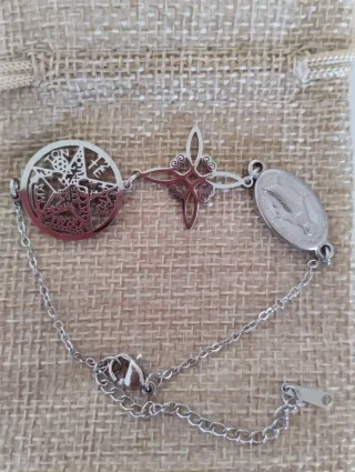 Pulsera con diseño de triple protección. - Elaborada en metal plateado. - Con nudo de Bruja -Tetragramaton -Medalla de San Benito Se vende activada .