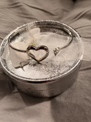 Elegante pulsera de plata con un diseño abierto y un detalle de corazón. - Pulsera tipo brazalete. - Acabado en plata brillante.