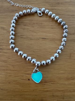 Elegante pulsera con un charm de corazón. - Diseño de eslabones con cuentas. - Charm en forma de corazón con acabado turquesa. - Cierre de mosquetón. Escucho ofertas razonables.