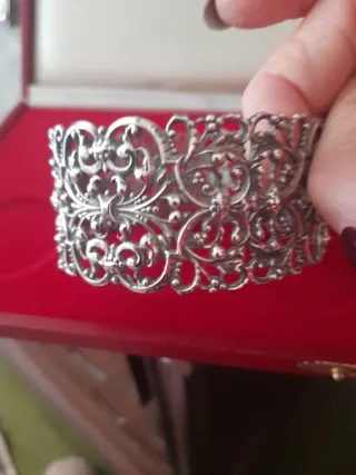 Magnífica pulsera de plata de ley 925 con un intrincado diseño de filigrana. Pesa 51 gramos y mide diámetro 7 cm y ancho 3,5 cm . Está perfecta y le he hecho prueba en joyería por lo que queda confirmado que es plata 925 ley y tiene el peso que indico. Desconozco marca platero.
